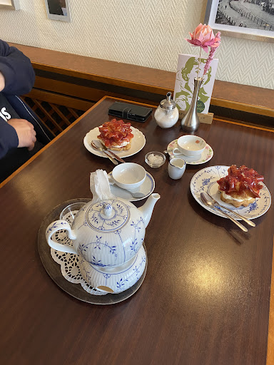 Traditional interior decor and two beach benches with tables outside. We had the local Ostfriesentee for 2 with teapot, heater, traditional China, block sugar (Kluntje) and cream as well as two of the local specialties Windbeutel, which are like giant profiteroles. This cafe offers them filled with cherries, whipped cream and topped with a cherry glaze. They were light, airy and lovely. Tea for two and the two pastries were 17.75€ which I find rather pricey. And although it was a nice experience overall for that price I would have liked a couple of napkins … and maybe a smile from the owner who...