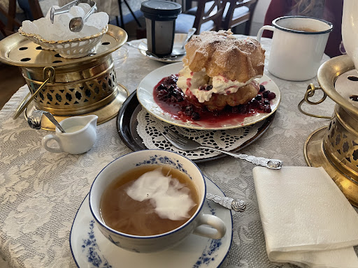 Ich informiere mich vorher gerne, ob man reservieren kann...vor allem mit Kindern ist eine Reservierung angenehmer. Hier war dies laut Website nicht möglich, aber ich hatte vorher die vielen guten Bewertungen gesehen, wir wollten u.a. Windbeutel essen und ich dachte mir: egal, wird schon. Dort angekommen wartete vor uns eine Frau, die mir sagte "Eben ist einer mit Reservierung reingegangen" und ich meinte nur "Okay, das ist ja Mist, ich dachte man könnte nicht reservieren". Kein Aufregen meinerseits. Aber die Bedienung hat es mitbekommen, ging an mir vorbei und meinte, ich solle mich nicht aufregen. Fand ich schon frech. Unten angekommen ging es recht schroff weiter...auch der Ton unter den Mitarbeitern, ich möchte da wirklich nicht arbeiten. Meine Kinder wollten Windbeutel mit Sahne extra, es sind halt Kinder die eigentlich keine Sahne mögen und sie sich extra zum probieren draufmachen wollten. Beim Aufgeben der Bestellung: kein Problem. Plötzlich stand der Koch (?) am Tisch und fragte genervt, wie er das denn bitte machen soll ohne Sahne/mit Sahne extra und wie wir uns das vorstellen. Da wurde ich dann auch etwas zickig, denn der Ton macht die Musik. Ich meine, mal ernsthaft: es gibt den unteren Teil vom Windbeutel, darauf kommen die Eiskugel und die Kirschen und darauf der obere Teil vom Windbeutel, das ist ja nun kein Hexenwerk. Wir hatten der Bedienung ja auch gesagt: einfach etwas Sahne extra geben. Dumm natürlich, wenn die Informationskette nicht funktioniert. Die Windbeutel haben aber geschmeckt, da kann man nichts sagen. Die Reibekuchen waren okay, es waren eher Kartoffelrösti. Pfannkuchen auch in Ordnung. Also man kann durchaus dort essen (und Tee trinken) gehen, uns sieht dieser Laden aber nicht wieder. Wie in allen Restaurants/Cafés zur Hauptsaison ist dort im Moment natürlich einiges los, aber wir merken schon als Familie mit Kindern Unterschiede, wie mit einem umgegangen wird. In dieser Lokalität ist man nur eine Nummer, die schnell Platz machen soll für die nächsten Gäste, die draußen im Regen warten. Woanders fühlen sich auch die Kinder...