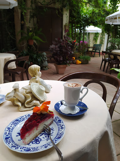 Unter dem Dach eines großen Baumes sitzt man, umgeben von Pflanzen, in einem schönen Innenhof, der jegliche Geräusche der Straße abschirmt. Eine wirklich traumhafte Umgebung, die sich abends mit ein paar gezielten Lichtern bestimmt noch viel mehr in Szene setzen ließe... Die bestellte Torte konnte, ebenso wie der äußert zuvorkommende Service, überzeugen. Auch das Hauptgericht hat uns...