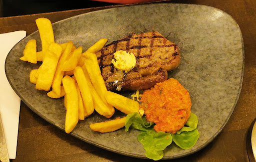 Read moreIst ein leicht gehobenes Restaurant. In anderen Restaurants bekommt man ein Brotkorb mit Soßen. Hier lediglich eine Packung Brot sticks . Hab auch noch unsauberes Glas für meine Cola bekommen.(nicht dreckig aber hatte schwarze Flecken drauf) Als Vorspeise gab es bei mir eine französische Zwiebel suppe in der gleich das ganze endstück einer Zwiebel drinne war. Und ein schwarzes etwas das außieht wie die Monate alte Pommes die man in der Frisöse aus Faulheit immer mit frittiert. Auf die Vorspeise haben wir auch ca 45min gewartet. Auf die Hauptspiese(2 Steaks mit Pommes) Haben wir dann auch nochmal so nh halbestunde gewartet. Ich EIN filetsteak Medium und meine Freundin ein Rumpsteak MEDIUM. Beide 300g. Ist zwar meckern auf hohem niveau aber ich habe dann zwei kleine bekommen. Und meine Freundin ein Steak das von innen so roh war das ich das Eisen daraus geschmeckt habe. Also kein Medium sondern eher rare. Klar kann sowas passieren. Meiner Freundin ist dann aber halt durch das Blutige der Appetit vergangen. Dann haben wir den Service geholt und der Chef kam. Und sagt nur das es ein wenig drunten ist. Er war echt nett und hat uns angeboten das nochmal kurz aufs grill zuhauen. Aber wie schon gesagt ist ihr der Appetit vergangen. Ein Dessert haben wir auch angeboten bekommen aber wie gesagt kein Appetit mehr. Also wollten wir dann bezahlen und mussten echt den vollen Preis von dem Steak bezahlen obwohl sie nicht mal die Hälfte gegessen hatte. Wie gesagt sowas passiert aber wenn man da 35€ für ein steak bezahlt (was jetzt nicht teuer ist aber trotzdem viel Geld ) Dann sollte man schon das bekommen was man...