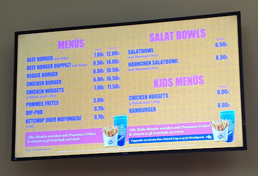 Read moreGestern Samstag waren wir wegen Essen i.R. Kindergeburtstag dort, zum Glück hatten wir einen separaten Raum mit Kids (das Licht ist leider nur automatisch an, wenn draußen bereits dunkel war❓‼️❓, an dem Moment war draußen ganz trüb, nass - trotzdem das Licht war nicht an) im Dunkel war unschön. Im normalen Essbereich sehr laut, purer Chaos, bei uns waren nichtdestotrotz die Mitarbeiter:innen, die mit uns zu tun hatten, sehr bemüht, freundlich. Geschmacklich na ja, kann man essen. Aber der Preis war schon überteuert. Wir hatten noch Nachbestellung: Chickenburger Single ohne Menü am günstigstens aufgerundet ca. 7€, fanden wir nicht angemessen! Pluspunkt: Man kann eigenes Essen und...