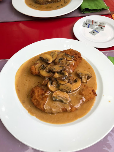 Hauptgang: Wir hatten alle Schnitzel bestellt, jeder ein anderes (Pfifferlinge / Wiener Art / Jäger Art / Paprika), und konnten hören, wie sie geklopft wurden. 😊 Als diese dann wirklich zügig kamen, wurden diese auf einem separatem Teller serviert. Und das war aufgrund der Menge notwendig, denn sie waren sehr groß. Die Beilagen waren üppig und frisch, die Pommes waren frisch und nicht tiefgekühlt. Bei den beiden Schnitzeln mit Pilzen waren jene in ordentlicher Menge dabei, und auch die Paprika-Sauce hat mehr als nur überzeugt. Bezahlt haben wir pro Paar für 2 Gerichte und 4 Getränke jeweils um 50€. Absolut angemessen, und wenn ich final die Qualität des Essens betrachte, dann war das tatsächlich sogar günstig. :) Essen: 5/5