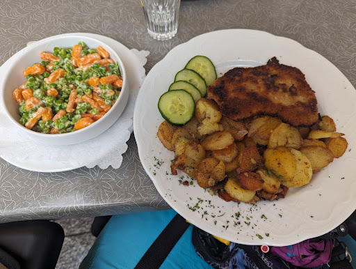 Read moreWegen einsetzenden Regens suchten wir hier draußen unter einem der großen Schirme Schutz. Die Bedienung wirkte zum Teil wie ein Köbes in Köln, also irgendwie unverschämt mit Charme. Wenn man damit Leben kann, hat es einen gewissen Stil und ich persönlich fand es gut. Der Milchkaffee war lecker, der Kuchen hausgemacht und schmeckte herrlich. Danach bekam ich noch (ungefragt) eine Empfehlung für eine Limonade, damit ich keine langweilige Apfelschorle trinken musste. Alles wurde sehr schnell gebracht und man blieb auf ein kleines Gespräch stehen. Beim Bezahlen gab es eine kleine Verwirrung, weil die Gäste, die vorher hier saßen wohl nicht bezahlt hatten. Das ließ sich aber im Handumdrehen und vollkommen unproblematisch klären. Ich war nur kurz drinnen, um Kuchen auszusuchen, habe dabei nicht auf barrierefrei geachtet. Die Toiletten haben wir ebenfalls nicht aufgesucht. Wir haben bar bezahlt und ich weiß nicht, ob Kartenzahlung angeboten wurde. Wenn ich ich nochmal hier bin, würde ich für ein hausgemachtes Stück Kuchen auf jeden Fall...