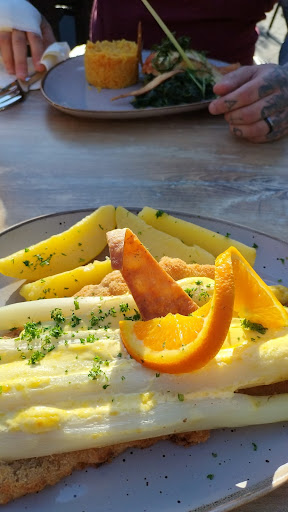 Read moreDank Neueröffnung und ständig vollen Parkplatzes wollten wir endlich das Stüffgen ausprobieren. Reservierung war drinnen ohne Probleme auch an einem schönen sonnigen Sonntagnachmittag möglich, draußen nur per spontaner Besetzung, aber es wurde immer mal wieder ein Tisch frei. Die Tische stehen recht eng, also war es sehr laut und dank mancher Hunde die die Wege blockierten muss man mal einen Umweg gehen. Zum Servicepersonal: jung und sehr freundlich, bemühten sich die Unterbesetzung auszugleichen. Es dauerte aber recht lange bis wir die Bestellung aufgeben konnten und auch ausgeliefert wurde, ca. 1 Stunde. Leider haben wir erst bei der Essenslieferung erfahren, dass das Salatbuffet schon zur Verfügung steht, das hätte die Wartezeit und Hunger gemildert. Leider waren von 6 Bestellungen nur 1 mit Begeisterung behaftet, nämlich Chicken nuggets mit leckerem Kartoffelpuree. Der Rest war gelinde gesagt geschmacksarm oder von der Portion was für 2 Minuten. -Champion - und Paprikaschnitzel: Schnitzel und Pommes gut, die Sause ohne jeglichen Geschmack Spieß war trocken, kaum Grillaromen, Grill Zucchini quasi roh, was Spitzkohl o.ä. bei einem Spieß sollen ist auch kaum nachzuvollziehen die Dorade für über 20 Euro war so klein bemessen (auch die Beilagen) dass der werdende Vater nach 2 Minuten aufgegessen hatte und schon von der Pommesbude danach träumte... Bandnudeln mit Gambas waren geschmacklich ok, aber auch hier Spitzkohl drin was gar nicht passte... komische Komposition
