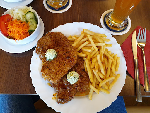 Nun zum wichtigsten. Dem ESSEN 😀 Eigentlich müsste draussen das Schild "Schnitzelhaus" angebracht sein. Denn dieses trifft den Nagel 100% auf den Kopf. Sechs Schnitzel standen auf unserem Tisch. Überwältigt von diesem Anblick wussten wir nicht, wo am besten anzufangen ist. Vom Wurmbergschnitzel über einem normalen bis hin zum Paprika-Sahne und Hawaii. Die Schnitzel brache, von der Größe her, alle Rekorde. Der halbe Teller gehörte dem Schnitzel. Die Beilagen wie Rösti, Kroketten oder Pommes, sind da eher unbedeutend. Wobei diese nicht minder bewertet werden sollen. Einzige was dabei fehlte und das wird jeder "Pommesesser" bestätigen, das im frischen Zustand etwas mehr gesalzen werden sollte. Nun wieder zum Schnitzel. Die Stücke sind etwa 1 cm dick und frisch. Keine Fertigware aus der Kühlung. Die Panade ist leicht, aber ein klein wenig zu Öllastig. Wobei man hier anmerken muss, das es mir so vorkam, als sei es gewollt. Durch das zarte Fleisch und dieser Panade zergeht es auf dem Gaumen und bringt einen, mir bis dahin völlig unbekannten Geschmack. Und Schnitzel gibt es ja viele regionale Variationen. Fassen wir mal zusammen: Ambiente: 4,9 Bedienung: 4,9 Essen: 5++ Alles in allem ist es ein gelungenes Konzept. Doch sollte sich jeder selbst ein Bild davon machen. Denn die Geschmäcker sind ja, Gott sei Dank, unterschiedlich. Wir können uns nur bedanken, für dieses super Essen und den...
