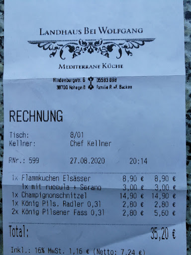 Ambiente sehr schön, aber… wir sind sehr enttäuscht! Hatten wir uns doch durch die positiven Bewertungen inspirieren lassen, erlebten wir unseren Besuch wie folgt. Tisch reserviert 18.00 Uhr, im Eingangsbereich Desinfektionsspender leer. Aussage der Chefin, muss ich gleich mal auffüllen. Wir bestellten ein Schnitzel mit Champignons und einen Flammkuchen mit Seranoschinken und Ruccula. Im Internet auf der aktuellen Speisenkarte gesehen für Schnitzel 13,50 €, Flammkuchen 9,90 €, tatsächlich bezahlt Schnitzel 14,90 €, Flammkuchen 11,90 €. Getränke kamen recht flott, das Essen nach 55 Min, was für uns nicht so schlimm war, da wir uns einen gemütlichen Abend zu zweit machen wollten. Das heißt, der Flammkuchen kam nach 55 Min, er bestand aus einem Teig ohne etwas drauf außer Serano und Roccula. Der Teig war kalt, nicht lau warm, nein kalt. Geschmacklich war der Flammkuchen mit den Zutaten ganz gut, besser noch wenn er warm gewesen wäre. Für den Teig, also nur den Teig haben wir 8,90 € gezahlt, Roccula und Serano 3.- €. Als der Chefin mitgeteilt wurde, dass der Flammkuchenboden kalt ist, sagte sie: Das kann gar nicht sein. Im Nachgang sagte sie, dass der Koch gesagt hat, dass der fertige Teig dort schon etwas länger gestanden hatte. Dafür gab es als Entschädigung ein Glas Sekt (das wir wohl mit dem hohen Preis irgendwie bezahlt haben) Das Schnitzel wurde mit Bratkartoffeln bestellt, der Koch hatte es wohl mit Pommes gemacht, somit hat die Chefin es wieder zurückgegeben. Eine Person konnte essen, die andere musste warten, aß dann als die erste Person fertig war. Soviel zu einem gemütlichen Abend zu zweit. Das Schnitzel war OK, die Champignons frisch, leider fehlte da etwas Salat. Die Bratkartoffel waren keine üblichen, sahen eher so aus als ob man mal schnell zwei Kartoffeln durchgeschnitten und diese kurz in der Pfanne geschwenkt hatte. Kurzum wir waren ziemlich enttäuscht. Beim Ausgang wollten wir uns dann die Hände desinfizieren, leider war der Spender immer noch nicht aufgefüllt. Ja, um Fragen der Chefin vorzubeugen, wir waren im richtigen Lokal. Schade, es hätte gut werden können. Da wir in Hohegeiß eine FeWo haben, hatten wir uns auf ein neues Lokal gefreut, aber da fahren wir doch lieber...
