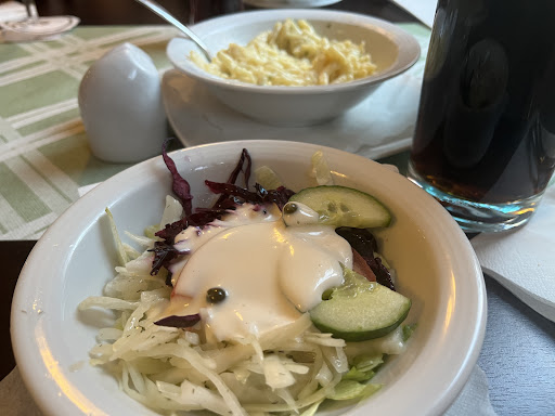 Als Hauptspeisen haben wir das Rumpsteak, das Wildgulasch, die Hähnchenbrust mit frischen Champions und das Paprikaschnitzel bestellt. Die Käsespätzle wurden als Kinderportion zubereitet. Sehr leckere Käsespätzle mit viel Käse. Bevor der Hauptgang serviert wurde, folgte ein Zwischengang mit dem kleinen Vorspeisensalat, der zu den Gerichten dazu gehörte.
