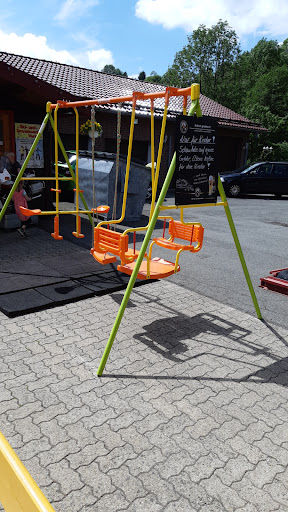 So jetzt der dazugehörige "Spielplatz". Ich glaube das man das so nichtmal nennen darf! Die Katastrophe am Rande der schönen Aussicht. ACHTUNG bei der Schaukel. Da wird sich nach einigen negativen Rezessionen nicht mal die Mühe gegeben das "Ding" zu erneuern bzw. Betonfüße unter zu machen damit das auch stehen bleibt wenn die Kids schaukeln. Der Rest ist Restloser Abzock Müll der seit gut 20 Jahren ausgedient hat. Dafür 1€ für 1min Fahrt zu nehmen ist abzocke. Es gibt nur eine Schaukel ind einbisschen Elektrodchrott wie z.b 1 Hubschrauber, 1 Rennwagen und 1 Motorrad ich glaube je 1€. Dann noch die alten Automaten wo man 1€ für Center Shock, 1€ für ich glaube ein Stein und 2€ für eine Überraschungskugel reinwirft. Achso eine kleine Motorradbahn gab es auch noch, aber da kenne ich den Preis nicht....