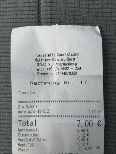 Natürlich darf man bei einem touristischen Gastronomiebetrieb nicht zu viel erwarten. Das Ambiente lud ein und wir stellten sehr schnell fest, dass das Personal völlig überfordert war. Auch hörten wir von anderen Gästen, dass diese schon sehr lange warteten, um zu bestellen. ALso bestellten wir schnell ohne in die Karte zu gucken ein Wasser still 0,4l, ein Aperol Spritz (Spritz schreibt man übrigens mit tz und nicht mit zz), eine Currywurst mit Pommes und einmal Pommes allein. Die Preise für Crurrywurst und Pommes waren nicht günstig, aber mittlerweile normal. Das Glas stilles Wasser kostete Euro 4,80, das Glas Aperol Spritz 'normale' Euro 7,50. Da das Glas Spritz nur halbvoll war, fragte ich nach, ob dies so korrekt sei. Mir wurde sofort mit Empörung erwidert, dass das ganz normal sei und mir wurde daraufhin sogar die kleine Flasche fertig gemischter Spritz, wie man sie im Supermarkt erhält, gezeigt. Als ich erwiderte, dass dies durchaus nicht normal ist, signalisierte man mir, dass ich ja keine Ahnung hätte. Schon sehr arrongant von der Wirtin. Erstens bin ich oft genug in Italien, um zu wissen, wie ein Aperol Sprtz serviert wird, und zweitens habe ich selber mal in der Gastronomie gejobbt; das was dort hinterm Tresen ablief, würde ich als Chaos bezeichnen. Aber da kann sich ja jeder selbst ein Urteil bilden. Im Anhang ein Spritz der Sportklause und ein Spritz aus Italien. Auch hier kann jetzt jeder selbst urteilen. Der Spritz in Italien kostete übrigens vor 4 Wochen...