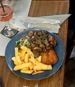 Mit dem Essen hatten wir wohl einfach nur Pech , anderes sah besser aus. Champignon Schnitzel war einfach nur trocken weil keinerlei Sosse dazu war , die Pommes überwürzt und drei Salatblätter waren nur vom Geschmack her mit Essig benetzt. Wir wurden die ganze Zeit nicht beachtet und evtl nach weiteren Getränken gefragt.