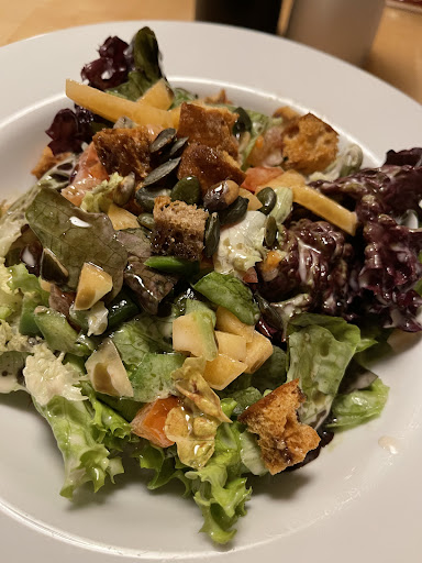 In 80 % der Besuche genießen wir den Steyrischen Backhend'l-Salat: Saftig, geschmackig, knackiger frischer Salat, mit einem (geheimen Haus- ) Dressing aus sanften Essig, Kürbiskernöl, Olivenöl (?) Kürbiskernen und 6 - 7 Hänchen-Teilen welche paniert und auf dem Salat drapiert sind und sich sehr gut vom Knochen lösen lassen. Das Hühnchen Fleisch hat hohe Qualität und schmeckt ausgezeichnet.