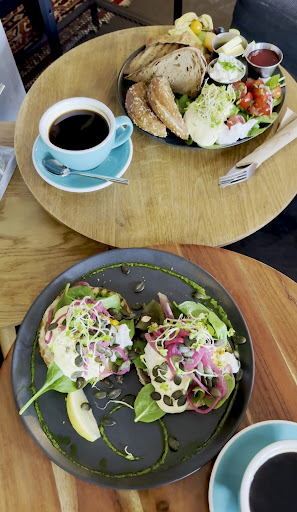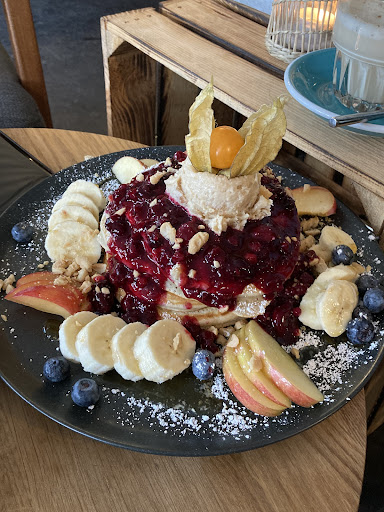 Place is popular, better reserve a place in advance, we were happy not to wait too long to get a table for two :) We had a Vegan Mezzeteller and P&J pancakes. Mezzeteller was very nice, but it could use an extra slice of bread/bagel, because the ratio of dips to bread was a bit not even, so that some of it was wasted. Dips were nice, but so called „Pink Hummus“ (beetroot sauce idk), was too plain and boring in a taste, it didn’t really go with everything else from the plate. Additionally, we took Chai Latte with homemade Sirup and big cappuccino. Chai latte was amazing, strongly reminded me of Indian Masala Chai, but cappuccino was disappointing. It had an uneven dark foam on the top, right after it was prepared, which meant that it’s gonna be a bitter coffee, and so it was. It was okay, but later I could also feel how sour the espresso was, which was not a good feature. Maybe they didn’t check their espresso in a while, or just overdo mine, or it could also be a poor mixing technique. But overall, food was good, staff is really cool and charming, they try their best during the heavy hours, and we loved the...
