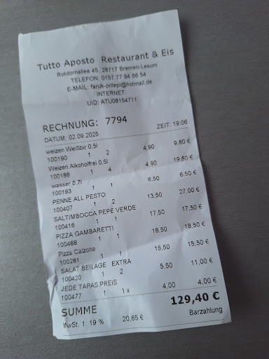 Heute, am 02.05.2024, waren wir zum vierten Mal im Tutto Aposto. Und erneut waren wir sehr zufrieden! Ich kann die negative Bewertung von Frau Römer nicht nachvollziehen! Wir hatten diesmal auf der Terrasse Platz genommen und hatten unseren Hund mit! Zuvor hatten wir telefonisch gefragt, ob das ok ist! Denn das gehört sich so! Im Gegensatz zu Frau Römer halten wir es nicht für selbstverständlich, dass Hunde in jedem Restaurant erlaubt sind! Schließlich könnte es unter den anderen Gästen Allergiker oder Leute geben, die schlichtweg Angst vor Hunde haben! Wenn man Rücksicht auf andere nimmt und sein eigenes Verhalten reflektiert, läuft es doch viel besser im Leben! 😉 Wir kommen auf jeden Fall wieder und freuen uns schon auf das leckere Essen und den tollen Service!