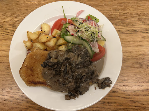 Read moreCharming decorations. On Sunday the jägerschnitzel and another type of schnitzel are on special for less than 20 euros. I sometimes don't like schnitzel because it is too greasy, but neither the schnitzel nor the potatoes were greasy. Good portion size. They had a great flavor, and the meat inside the schnitzel had good flavor. Mushroom sauce was very good, and salad was fresh. Portions were good. You can't tell in the picture, but there are mushrooms under the schnitzel. Rather than be very wide and thin, the meat is a little thicker but very tender. Like a lot of restaurants in this area, the menu is in German and English. Glass of wine was slightly less...