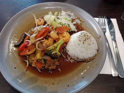 We had a rice dish with shrimps. Whereas the ingredients as such weren't bad, the sauce definitely was. We ordered a dish labelled "pikant" which is German for spicy and/or hot. However, the sauce tasted like water with a bit of soy sauce and if I had had a salt dispenser on the table, I would have probably emptied it on my plate. The sauce is the most important aspect about such a dish and you definitely have to get that right.* When I told the waitress about this experience in a neutral tone, she tried to convince me that "pikant" didn't stand for spicy and/or hot. Being a German, I still kind of feel like I know what that German word means.