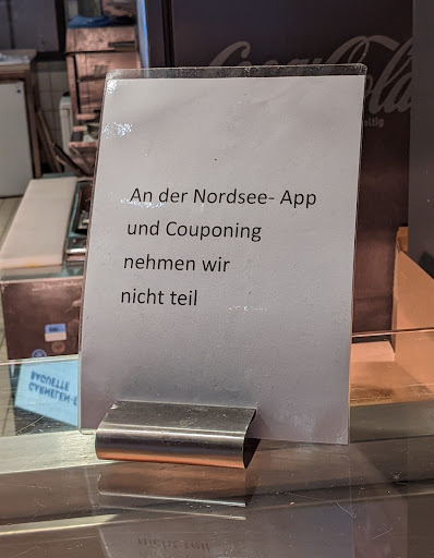 Das positive vorweg: das Essen hat geschmeckt und hatte ein angemessenes Preis-/Leistungsverhältnis. Die Öffnungszeit ist abends bis 19.00 Uhr, ließt sich gut, hat aber nichts mit der Realität vor Ort zu tun. Bereits um 18.00 Uhr wird nur noch widerwillig Essen zubereitet. Wenn man eine warme Speise möchte, wird man rst einmal mit der Bemerkung ausgebremst "das dauert jetzt aber...". Wenn man dann immer noch Hunger/Lust auf eine warme Mahlzeit hat, kommt die nächste Hürde "der Grill ist schon aus, wir haben nur noch eine Fritteuse an...". Bleibt man standhaft und bestellt, der nächste Schwachpunkt: Nordsee hat einen Couponflyer verteilen lassen, aber die Mitarbeiter wissen nicht, wie sie die Kasse überreden müssen, damit diese die Coupons akzeptiert. Gott sei Dank gab es noch eine zweite Mitarbeiterin, die zumindest ihre Kollegin auf den richtigen Weg bringen konnte. Dann die nächste Überraschung: die ausgelobten Preise werden zwar angezeigt, aber die Kasse rechnet noch einmal Mehrwertsteuer dazu. Kommentar der Mitarbeiterin "...das ist bei uns normal, das macht die Kasse so, da können wir nicht machen...". Meiner Meinung nach eine mehr als ungewöhnliche Praxis, um nicht noch deutlichere Worte zu gebrauchen. Bereits um 18.20 Uhr wird dann schon mal vorsorglich der Gastraum mittels Rolltor geschlossen, die Gäste können ja am Tresen vorbei den Laden verlassen (der Wink mit dem Zaunpfahl: jetzt ist aber gleich Schluss...). Bei der Geschirrrückgabe steht dann auch schon mal Wischmop und Eimer im Weg und man wird mit bösen Blick gestraft, wenn man kein Tablett...