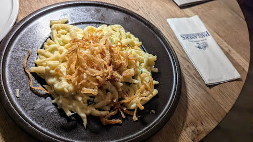 Drei von uns bestellten Wurstsalat, einmal als Vorspeise, zweimal als Hauptspeise. Als die Hauptspeise kam, wunderten wir uns, wieso diese genauso klein war wie die Vorspeise. Der einzige Unterschied waren zwei halbe statt einer halben Scheibe Brot dazu. Und 7 EUR Preisdifferenz. Natürlich haben wir beim Kellner nachgefragt, der sich sogleich entschuldigte und uns zeitnah nochmals die gleiche Portion brachte. Daraus ergab sich eine normale, aber noch immer keine riesige Menge.