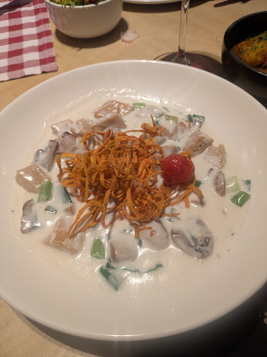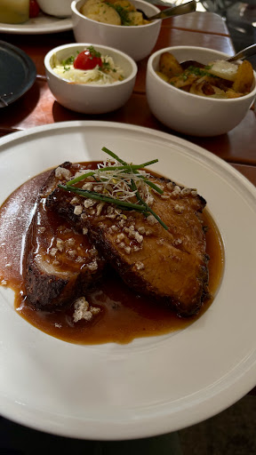 Das Gulasch welches ich bestellt habe ist eine absolute Katastrophe. Es wird mit Schweinefleisch und Rindfleisch serviert, welches sehr trocken und teilweise zäh war. Beim Schwein habe ich schon mit gerechnet, aber das Rind hat mich besonders enttäuscht. Die Sauce ist sehr geschmacklos und schmeckt stark nach Fertigsauce, sehr geschmacklos und viel zu Dick angesetzt. Zu dem steht auf der Karte zum Gulasch die Champions, serviert wurde mir das ganze aber als mix mit Pfifferlingen. Das Gericht im ganzen habe ich so stehen lassen, ungenießbar.