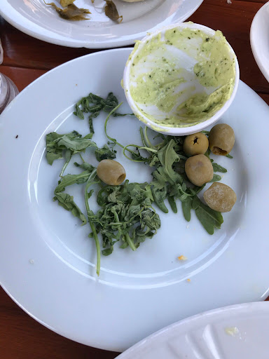 Gemeinsame Vorspeise: Aioli mit Brötchen wenig Knoblauch an der Aioli (die übrigens grün war), dünnflüssig und nicht cremig, Brötchen waren hart und trocken, der Rucola auf dem Teller war verwelkt und die Oliven hatten Salzränder auf der Haut (siehe Bild).