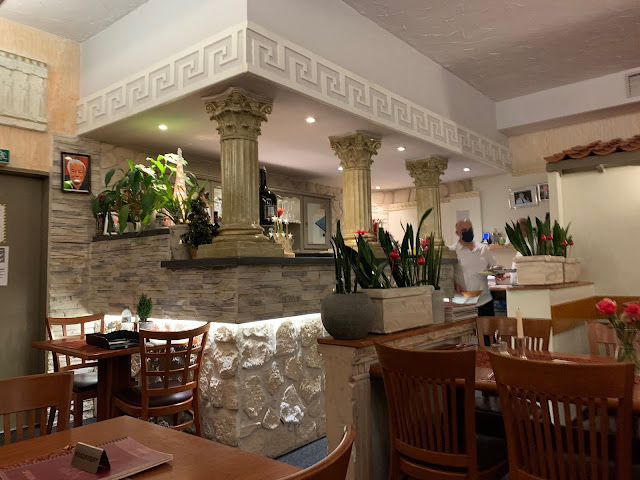 Möglicherweise ist es die günstige Lage in Bremen-Schwachhausen oder es sind die Parkplätze unmittelbar vor dem Eingang, weshalb das Restaurant Rhodos gut besucht war. Auch die Herren-Toiletten waren sauber, der Geruch angenehm wohlriechend. Das Waschbecken erfüllt nicht die Ansprüche eines Designers, doch es erfüllt seinen Zweck. Ein wenig problematischer ist die Speisekarte. Obwohl gut gefüllt mit unzähligen Fleisch- und Fischvarianten gibt es nur ein einziges Haupt-Gericht für Vegetarier. Das waren Spaghetti mit Tomatensauce und ein Stück Käse (siehe Photo, in der Speisekarte die Nummer 81). Für Veganer gibt es nichts auf der Speisekarte. Die Spaghetti schwammen in Öl, die Würze hinterließ bei mir ein Fragezeichen, welche Botschaft der Koch mir mit der Würze senden wollte. Köstlich waren die heißen Feigen von der Nachspeise mit Vanilleeis und Sahne. Der Gastraum, bestehend aus einem großen und einem kleinen Raum, wirkt dichtgedrängt. Es fehlt ein wenig die Großzügigkeit, Gemütlichkeit entstand in meiner Wahrnehmung trotz der Enge auch nicht. Weshalb die Fensterbank (siehe Photo) mit zwei Figuren, einer Pflanze und einem kleinen Wasserbrunnen so voll gequetscht wurde, erschließt sich dem geneigten Rezensenten eher nicht. Es schränkt den Blick ins Freie ein. Die Kellner waren in meiner Wahrnehmung nicht überbordend freundlich, es war eine aufgesetzte, distanzierte Freundlichkeit, die öfters in der Gastronomie zu beobachten ist. Als Gast fühle ich mich nur eingeschränkt wohl. Mein Fazit für das Restaurant Rhodos: Auch wenn sich der Name des Restaurants auf eines der antiken Weltwunder bezieht (der Koloss von Rhodos - siehe Photo), so sollte der Gast keine Wunder im Restaurant Rhodos erwarten. Die Bedienung, die Speisen und die Räumlichkeiten, alles guter Standard. Vegetarier und Veganer sollten das Restaurant Rhodos meiden, wir sind nicht...