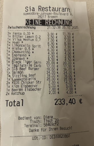 Read moreTest an einem Sonntagabend im August 2023, bei dem das Restaurant leider weit hinter den Erwartungen geblieben ist. Lage etwas abgeschieden in der Bremer Überseestadt, daher aber genug Parkplätze fußläufig erreichbar. Wir waren die einzigen im gesamten Restaurant. Die Räumlichkeiten sind modern und neu, optisch macht alles einen gelungenen Eindruck. Zuerst fielen uns dann aber die sehr kleinen und beengten Tische auf. Man hatte kaum Platz um vernünftig zu sitzen. Die "Kellner" sind ein Witz und wer im Zusammenhang mit den Personen das Wort Kellner benutzt, beleidigt damit jedem passionierten Kellner. Zuerst einmal wurden wir (Ü20-Ü50) von 2/3 der Angestellten geduzt. Als wir Merlot und Cabernet Sauvignon bestellten, wurden wir jeweils gefragt, ob dies ein Rot- oder Weißwein sei?! Als der Wein dann kam, war ein Glas oben abgeplatzt. Die Rotweine an sich schmeckten billig, es gibt definitiv Dutzende Discounter Weine die deutlich besser schmecken. Auffälligkeiten zur Speisekarte: Sämtliche Gerichte tragen ohne weitere Beschreibung Namen wie "Sia´s Salat", auch auf Nachfrage konnte die Angestellte uns nicht erklären wie sich der Salat denn zusammensetzt. Auf der Weinkarte finden sich zwei Weine für über 200€, natürlich ein Schreibfehler. Das Konzept der Speisen wirkt insgesamt ein wenig wirr, von Schmorgerichten über Fisch bis Pizza ist alles vorhanden. Zum Essen: Die Portionen sind alle eher klein, was uns aber nicht gestört hat. Der bestellte Beefburger war maximal enttäuschend wirkte auf den ersten Blick wie ein Schwimmbadburger und schmeckte leider auch so, auch wenn das Fleisch definitiv frisch war). Der vegane Burger war ein Ordnung, durchschnittlich. Das Ribeye Steak schmeckte lecker, allerdings gab es keine Beilage, diese musste man extra bestellen. Herausragend war dagegen wirklich das Slow-Cooked Beef!