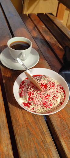 Was toll war: die gläsernen Eisbecher selbst kamen aus dem Eisfach und waren schön kalt. Tolle Sache, wenn's draußen warm ist 👍 Man sieht es vielleicht noch auf meinem Bild: der Fuß des Bechers ist noch gefroren. Habe ich so noch nirgends erlebt.