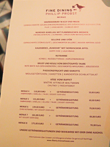 Read moreEin Glanz in Bremerhaven im Schmuddelwetter... Ein Abend zum glücklich sein! Draußen kalt und innen warm, nein, mehr noch, so herzlich wurden wir behandelt. Gleich bei der Reservierung wurden wir nach Unverträglichkeiten gefragt, derer es bei uns zum Glück keinerlei gab. Zuvorkommender Service, ganz persönlich und einfach in allem hervorragend. Die Kompetenz bezüglich des Weines hat uns voll überzeugt, wir kamen schnell ins Gespräch und wurden perfekt beraten, auch Gedanken von uns wurden aufgenommen und wir hatte die ganze Zeit das gute Gefühl, dass es sich nicht um eine "einseitige" Veranstaltung handelt, sondern um ein gegenseitiges Erfreuen an guter Speise und Trank. Die vielen Grüße aus der Küche brauchen wir hier nicht zu erwähnen, alle wunderbar und von Lust und Einfallsreichtum gezeichnet, wie schon in vielen anderen Rezensionen beschrieben. Die 4 Gänge waren ein Gedicht von Phillip Probst und zwischendrin eben immer wieder eine kleine zusätzliche Episode. Wir durften sogar eine Aubergine erraten, die wir nicht erraten haben, weil so raffiniert und wir so noch nie eine solche zubereitet hatten. Wir, die wir selbst mit Liebe kochen und das Essen zelebrieren waren rundherum glücklich und begeistert. Und zur Krönung bekamen wir noch die Zubereitungsart der zarten, rosa Entenbrust auf der Abdendkarte handschriftlich vom Küchenchef persönlich überreicht. Ein Abend, der uns in Erinnerung bleibt und sicher bei jeder Ente wieder Erwähnung...