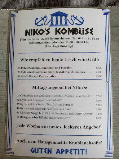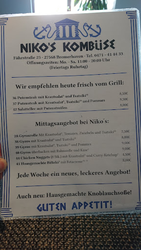 Read moreKleines und von außen unscheinbares Restaurant. Innen ziemlich beengt, vier kleine Tische mit Barhockern. Was uns allerdings als Speisen geboten wurde, passt so gar nicht in das äußere Bild. Zu dem "Nicos Spezial-Teller" gab es, erstaunlicherweise, keine Pommes sondern ein kleines Brötchen. Wir haben die Pommes also separat dazu bestellt. Was uns serviert wurde war ein so mit Fleisch gefüllter Teller, dass darauf überhaupt keine Pommes mehr Platz hatten. Das restliche Fleisch wurde uns eingepackt und mitgegeben. Es war nochmal eine Mahlzeit. Das Fleisch war wirklich sehr sehr lecker, genauso wie das Tzatziki. Zwischendurch kam der Betreiber sogar zu uns an den Tisch und erkundigte sich ob alles okay sei.