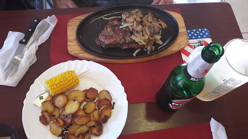 Read moreWow, ich weiß ehrlich nicht was ich dazu sagen soll. Mein Mann ist Amerikaner und hat wohl vor Jahren dort schon mal sehr gut dort gegessen, weshalb er mich auf einen Samstag Abend dorthin einladen wollte... Wir hatten reserviert und bekamen einen Tisch mit voll gekleckerter Tischdecke. Nun gut, okay. Dann stellte ich meine Tasche auf die Heizung, die direkt am Tisch angrenzte und bei der die Abdeckung fehlte (die direkt neben dem Tisch stand) und die Heizung war nicht nur staubig sondern schlicht versifft!! Schien aber keine Sau zu interessieren! Wir bestellten die Getränke, bei dem ich hier schon das falsche bekam und als wir ein paar kleinere Fragen zu dem Essen hatten, beispielsweise wie groß die Hähnchenstücke seien konnte man uns keine Auskunft geben... na gut. Für unseren Sohn bestellten wir eine Kinderportion, bekamen jedoch eine normal große. Der Burger war okay. Die Bratkartoffeln waren jedoch frittiert und das Steak zäh. Dazu gab's „Saison“Gemüse aus der Dose. Vielleicht sollte denen mal einer sagen, dass Bonduelle das ganze Jahr Saison hat! -.- Ganz ehrlich, ich hab viel Verständnis aber irgendwann hört es dann auch auf! Der ganze Laden wirkt vernachlässigt und herunter gekommen (einer der Vorhänge hing zur Hälfte runter). Bedienungen, denen die Wünsche ihrer Gäste Schnuppe sind und leider genauso riechen, wie der Laden :-/ Schade eigentlich doch ich hab selten so schlecht gegessen....
