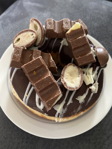 Doch für einen Donut mit Glasur und zwei Riegeln Kinderschokolade und zwei Schokobons dekoriert sage und schreibe 3.65 Euro zu verlangen ist schlicht nur noch unverschämt!!! Zumal der Preis nicht ausgezeichnet war und der Donut auf dem gleichen Tablett lag wie die Puddingberliner für 1.80 Euro.