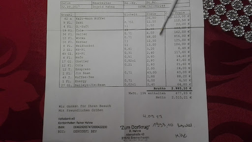 Das Restaurant wird von Herrn Hahne super geführt; er ist zugleich der Küchenchef und bietet eine große Auswahl an sehr guten und reichlichen Speisen. Seine Frau kümmert sich kompetent, ja fast mütterlich, um die Wünsche der Restaurantgäste bei der Organisation und Ausrichtung von Feierlichkeiten; steht bei allen Fragen den Gastgebern zur Seite. Das Fachpersonal ist sehr freundlich und hilfsbereit. Alles im Allen ein zu empfehlendes Restaurant in Bremerhaven-Wulsdorf, wenn da nicht ein kleiner Wehmutstropfen wäre. Die Rechnung für unsere Hochzeitsfeier beinhaltete pro 0,7 l Vodkaabsolut den stolzen Preis von 68,00 €, bei 12 berechneten Flasche eine Summer von 816,00 € ---na dann Prost. Achtung: Bei der Terminabsprache und den mündlich Abmachungen sollten die sich die Preise sagen lassen und sich dieses dann auch montieren, Vertrauen ist gut, Kontrolle ist besser. Ich habe dann nachverhandelt und auf die Gesamtrechnung (2.993,10 €) schnell und ohne jegliche Debatte von Seiten Herrn Hahnes eine Nachlass von 300,00 € erhalten, d.h. die Flasche Vodka kostet dann "nur" noch 43,00 €, wobei mir nun die 4 übrig gebliebenen Flaschen (bekam ich geöffnet mit nach Hause) sicher als "goldene Tropfen" während der weitere Ehezeit in Erinnerung bleiben werden. Das Restaurant ist sehr...