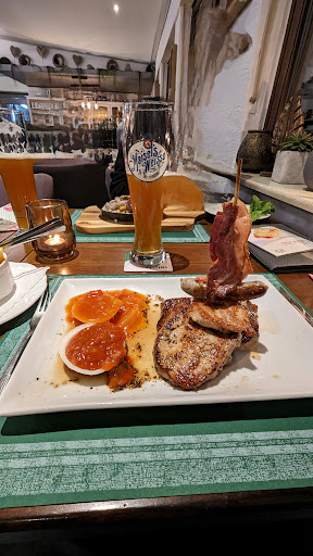 We had a Christmas dinner here. Before reserving, we had checked out the menu which looked quite nice with enough choice and a little plus compared to other German restaurants in the area. What a deceitful event it turned out to be! We started with drinks, that didn't come together for our party of 9 and where my sister got a ginger ale without any carbonic acid in it left, so toasting had to wait and was interrupted by the first course after only a few minutes. The Christmas "menu" was by far the easiest and cheapest way for this restaurant to make a quick buck by giving no choice in this only first course: salty water with disgusting floury balls that should have resembled a broth. Dessert was also not possible to choose, but a very boring and bad prepared cold Bratapfel, with some whipped cream on top and crumbled "spekulatius", crushed cookies, which was boring, a waste of calories and the arranging of the dish could've been done by a 5 year old. Mains had 6 options, with a few reasonable options, but zero prepared plates: they simply dumped the sometimes reasonable, but with others overcooked steak with a large tendon inside, on a plate without garnish/plate arrangement or whatsoever, every person able to cook a steak could've done this, even though this restaurant is bragging about its chef online, I've never had Christmas with less phantasy and eye for plate preparation and decorum. In short: completely overpriced, with an average of well over 40 euro's per person, completely rushed servants, we left within a little over 90 minutes, because pushed the courses through so fast. My nephew only got chicken nuggets with fries, but no dessert or children's ice-cream. In general, but at least for Christmas Dinner, because reviews and menu options on the website looked nice upfront but were very disappointingly unavailable : to avoid, way too expensive, boring, culinary unworthy for...