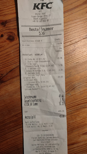 A separate point is that KFC overall has no customer support. What they say on social media doesn't count; they never respond there! I had a similar experience at McDonald's, but it wasn't in Germany, and everything was top-notch. Here, it’s bad at both places, but with KFC, it's critically bad compared to competitors. Don’t buy their hairy chicken — it’s an insult and a waste of money! I can't even get my money back...