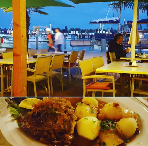 Read moreDie Außenanlage und der traumhafte Blick auf die Hafenkulisse ist ein riesiger Pluspunkt für das Lokal. Die Inneneinrichtung ist nach einem Aufenthalt auf der Terrasse, die mit netten Möbeln, Palmen und vielen Lichtquellen ausgestattet ist, fast schon erschreckend. Es ist zwar alles sauber, aber die Einrichtung ist eher ein authentischer Mix aus 80er Jahre Eisdiele und Seniorenaufenthaltsraum. Die moderne, chillige, zum verweilen einladende Atmosphäre von draußen, sucht man drinnen leider vergebens - man könnte denken, das innen und außen, zwei völlig andere Konzepte umgesetzt werden.