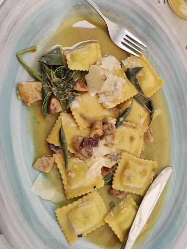 Read moreIch würde nicht empfehlen dort Ravioli AI Porcini zu bestellen. Das Essen kam in einer Aluschale, die für gewöhnlich bei jedem Lieferdienst zu 2/3tel gefüllt ist. Hier war nicht einmal ein Drittel drin. Das macht einen Preis pro Nudel von über einem Euro mit minimalem Einsatz von maximal 1-2 Steinpilzen. Dazu sehr trockenes Brot. Geschmacklich war es okay, die Soße lecker, die Pilze okay leicht gnartschig, das Erlebnis und das Essen in der Box nicht besonders ansehnlich, selbst für ein Lieferdienst. Die Pizza war okay, der Belag zu mittig, sehr dunkel gebacken, dafür der Boden unten aber super weich, viel zu viel Feuchtigkeit, vielleicht war der Ofen im Osterstress nicht warm genug... . Im Restaurant selbst mag das Erlebnis gut sein, beim Lieferdienst sollte meiner Meinung nach nachgebessert werden.
