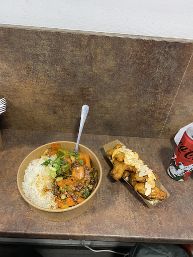 Pan Fire Rice: Der Reis hat nach absolut nichts geschmeckt. Obwohl Teriyakisoße (?) oben drauf war. Noch nie so einen schlecht gemachten, gebratenen Reis gegessen.