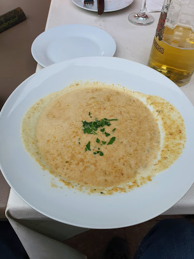 Die Terrasse war voll - zu voll - und es war eine Atmosphäre, wie in eine Bahnhofshalle. Wir waren zu neunt. Als Bedienung standen ein richtiger Kellner und zwei wenig bis nicht-Deutsch sprechende Aushilfen zur Verfügung. Nach geschlagenen 25 Minuten kam die Speisekarte, nach weiteren 15 Minuten die Getränke. Der Gruß aus der Küche, bemessen für 4-5 Personen, wurde nach einem Hinweis noch einmal nachgelegt. Die Vorspeisen kamen nach insgesamt 70 Minuten, einzeln oder in Zweiergruppen - an ein gemeinsames Essen war nicht zu denken, eine Vorspeise fehlte! und wurde dann nachgelegt, die Suppenteller waren bis zum Rand hoch mit Suppe verkleckert. Nach weiteren 30 Minuten ging es dann mit den Hauptgerichten los, wieder einzeln oder in Zweigruppen, wieder kein gemeinsames Essen, wieder fehlte ein Essen, bei einem Essen fehlte der Beilagensalat, das ganze zog sich. Das fehlende Essen wurde durch ein falsches Essen nachgelegt und dann noch mal getauscht.