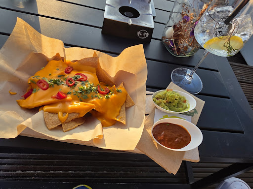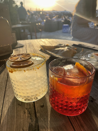 We absolutely love it here! If you go on a weekend, you might have to queue up, but usually it moves quickly. It’s much less busy during the week. There are multiple seating areas, some in a sandy area that reminds you of the beach, others in a lounge area, but all outdoor, so bring a jacket as it can get cool in the evenings. The cocktails are great, food tastes delicious, and the staff are friendly. You can pay with cash or card, and you can park in the garage below, which is quite expensive yet practical. Perfect place for date night or an evening...