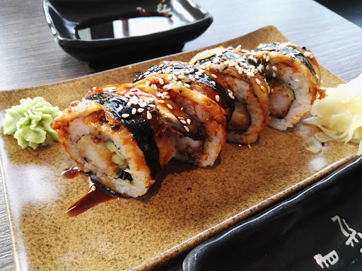 Als kleine Nachspeise ließen wir uns aus der reichhaltigen Sushikarte noch "Dragon rolls" bringen. Innen Garnele in Tempurapanade, obenauf gebratener Aal, der beim servieren noch warm war. Ein Hochgenuss!!! Ein kleines gut gekühltes Glas prickelnder Pflaumenwein folgte auf Kosten des Hauses.