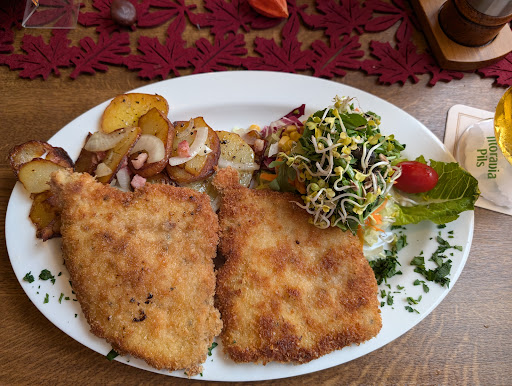 The restaurant rating follows, I did not stay at the hotel. I had a couple of Moravia Pils and a 'Schweineschnitzel Wiener art' The schnitzel was outstanding in taste, quality and presentation. I would rate it as one of the best I have had for a long time (top 10%, probably out of at least 50 restaurants). I try schnitzel at many places, since it is difficult to get wrong, although also difficult to get just right, so it shows the culinary skills of the cook in a standardized way. The service is polite and prompt. The atmosphere is of an old pub where old friends (and old people) regularly gather for a beer together, and the furniture and decor matches that. Definitely worth visiting for a beer...