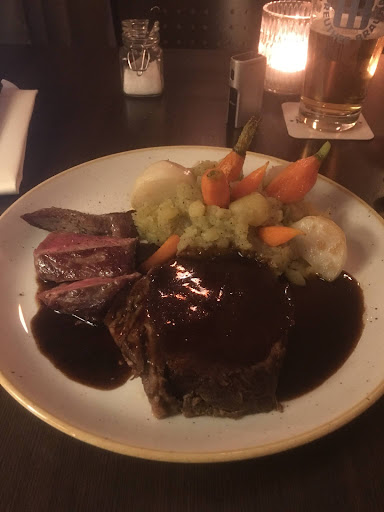 Der Wolfsbarsch mit Gemüse für meinen Gatten war total lecker! So auch mein Duett vom Wild (laut Tagesangebot. Heute: Geschmortes vom Reh, dazu ein kleines Stück Filet vom Reh) mit Gemüse und Kartoffelgratin. Aber auch hier hätte ich mir das Essen nicht lauwarm sondern heiss gewünscht. Es hätte auch gerne etwas mehr von der Hauptspeise auf dem Teller liegen dürfen, mein erster Gedanke war 'Wo ist hier der nächste Mc......'
