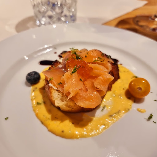 Read moreDas Restaurant präsentierte sich stilvoll mit einem Kamin, der abends für eine angenehme Atmosphäre sorgte. Die Tische waren ansprechend gedeckt und das Personal zeigte sich aufmerksam und freundlich. Zu den weniger erfreulichen Aspekten des Abends gehörte das Schild am Tisch, das darauf hinwies, dass keine Kartenzahlung möglich ist. Als Hotelgäste nahmen wir an, dass wir die Rechnung auf unser Zimmer buchen lassen könnten, was sich am Ende des Abends als nicht möglich herausstellte. Wir mussten unser gesamtes Bargeld zusammenkratzen, um die beträchtliche Summe zu begleichen. Für ein Restaurant dieser Kategorie halte ich Barzahlung als einzige Option für unpassend. Bei der Auswahl der Vorspeise waren wir uns unsicher, also bot uns der Kellner eine "Überraschung des Hauses" an. Hier rate ich jedem, sich vor solchen Überraschungen in Acht zu nehmen und vorher nach dem Preis zu fragen. Für ein einfaches Schnittchen wurden uns 12,50 € pro Person berechnet. Das Bild der Vorspeise füge ich an. Ich wählte einen Salat mit Rinderfiletstreifen, der für 17 € aus ein paar Blättern Eisbergsalat, einer geviertelten Tomate und einem Stück Gurke bestand, alles ertränkt in Dressing. Das geht definitiv besser. Das Rinderfilet bestand aus vier dünnen Scheiben, die jedoch perfekt gegrillt und sehr lecker waren. Die Gerichte der anderen waren geschmacklich in Ordnung, aber die Portionen waren übersichtlich. Nach dem Essen entschieden sich die Männer für einen Grappa und baten um eine Empfehlung, fragten aber wieder nicht nach dem Preis. Für den Grappa wurden stolze 14,50 € pro Gläschen berechnet. Es ist sicherlich unsere eigene Schuld, dass wir nicht nach den Preisen gefragt haben und das bittere Erwachen kam mit der Rechnung. Und für uns bleibt leider ein etwas bitterer Beigeschmack an einen eigentlich schönen Abend, denn 50 € für vier kleine belegte Baguettescheiben zu bezahlen kann einem die Laune...