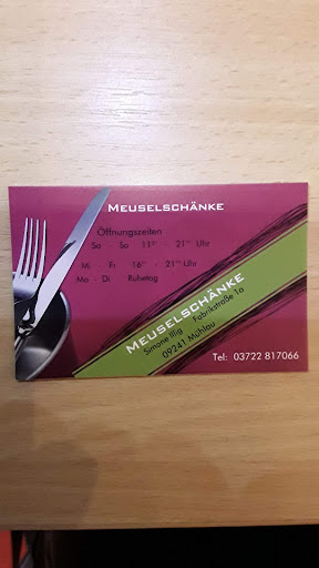 Read moreNachdem wir bereits bei einer Geburtstagsfeier in der Meuselschänke zu Gast waren, überlegte ich mit meinem Partner einen ruhigen Abend in eigentlich schöner Atmosphäre zu verbringen...anstandshalber riefen wir vorher für eine Reservierung an, allein schon wegen unserer drei gut erzogenen Hunde. "Wir sind kein Zoo" war die Antwort auf unsere Frage, ob wir mit Hunde kommen könnten. Kein einziges Restaurant/ Gaststätte hat uns bisher verboten, den Gastraum oder Biergarten mit den Dreien zu betreten. Ein sehr unhöflich, kurz angebundener Mann, dessen Höflichkeit wahrscheinlich im Kochtopf verloren gegangen ist, gab auch nichts mehr kluges von sich, außer er bräuchte keine Gäste....nun gut, da ich in der Umgebung eine Hundeschule besitze werde ich diese Gaststätte definitiv nicht weiter empfehlen. Gut zu wissen, dass ich auch viele Kunden pflege, die auch gern Mal ohne Hunde Essengehen....in der Meuselschänke wahrscheinlich dann...