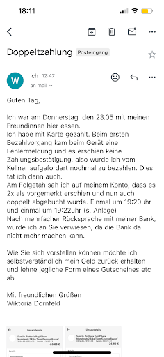 Edit: Da es doch von meiner Bank gewünscht war das Anliegen mit dem Restaurant persönlich zu klären, schrieb ich eine Mail da das Restaurant für einige Tage geschlossen hat. Die Antwort ist mehr als Frech, dabei hatte ich eine faire Rezention geschrieben und Positives ebenso beschrieben. Beim Telefonat wurde lediglich gefragt, pb ich das schon mit der Bank geklärt habe, zudem Zeitpunkt hat die Sachbearbeiterin dies auch bejaht. Also sagte ich dies am Telefon und ein Angebot bezüglich einer Rücküberweisung wie in der Mail steht wirde nicht besprochen. Ich hoffe nun sehr, dass die Rückabwicklung auch stattfindet und alles reibungslos klappt. Ein weiteres Mal erstrecht nach dieser frechen Antwort kommen wir...