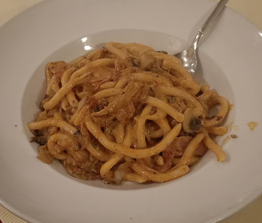 Read moreIch bin ein bisschen gespalten hinsichtlich der Bewertung. Ohne Frage, der gesamte Servicebereich ist sehr freundlich. Wir waren zu viert dort und hatten jeder eine Vorspeise. Als die ersten beiden fertig waren, wurden sofort die Teller abgeräumt obwohl wir noch gegessen haben. Außerdem wurde ziemlich deutlich gesagt, dass wir doch die Gabeln wieder vom Teller nehmen sollen, da sie ja auch zur Hauptspeise passen würden. Deswegen die Abzüge beim Service. Das Essen war jeweils o.k aber mehr auch nicht. Spaghetti Carbonara mit Sahnesoße und bei den anderen Pastagerichten alles mit Tomatensahnesoße ist mir dann doch zu sehr dem deutschen Geschmack angepasst. Andere mögen es aber wir werden wohl nicht...