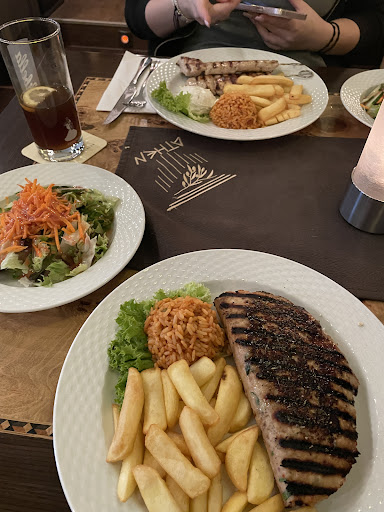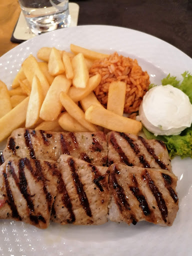 Aber geschmacklich hat das Essen leider gar nicht überzeugt. Der hausgemachte Krautsalat und der Blattsalat waren höchstens mittelmäßig und nichts Besonderes. Besonders enttäuschend war jedoch unsere gemische Fischplatte. Die Scampi waren komplett mit Fett vollgesogen, geschmacklos und bloß kurz frittiert. Auch die Calamari waren frittiert und von der Qualität eher durchschnittlich — nichts Besonderes. Auch das Schweinesteak und das Souvlaki waren eher zäh und geschmacksneutral. Ich habe beim Lesen anderer Bewertungen festgestellt, dass einige das Fleisch gegrillt bekommen haben — bei uns wurde es allerdings in der Pfanne gebraten, und das hat man geschmeckt.