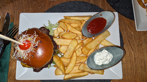 Optisch sehr gut hergerichtet kamen dann auch die Hauptspeisen. Nach 1,5h Wartezeit war die Optik aber sekundär, denn wir hatten Hunger. Und so blieb der Eindruck wie vom Gruß aus der Küche und der Vorspeise. Es war durchwachsen. Die Pommes und die Kartoffelspalten waren nicht OK. Die Nudeln mit Lachs waren lecker. Die Burger waren OK aber in Kombination mit Pommes oder Kartoffelspalten zu viel Essen auf dem Teller. Das Schnitzel mit Spiegeleiern war genau das und auch OK.