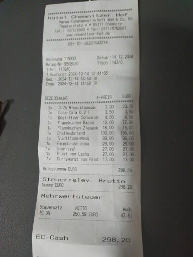 Read moreSchleppender Service, teilweise etwas unbeholfen. Kaum waren wir im fast leeren Restaurant vom Kellner platziert, kam die Nachfrage der Kollegin, ob wir reserviert hätten. Der Kellner wollte die Getränkebestellung aufnehmen, was wir aber entweder überhört haben oder was er nicht ausdrücklich so gesagt hat. Erst der ziemlich daneben liegende Hinweis des Kellners, dass man das bestellte Essen auch gerne pürieren könne, damit wir es trinken könnten, machte uns darauf aufmerksam. Achtung an alle, die den trockenen Rosé bestellen: Der Portugieser Weißherbst ist dieses Jahr "etwas dunkler geraten", er sah aus und schmeckte wie Rotwein (wenn es denn so ist, wäre ein Hinweis bei der Bestellung nett gewesen). Die Frage am Nebentisch nach dem Hausbier wurde beantwortet mit: "Schmeckt wie Radeberger, nur besser." Insgesamt durchaus Bemühungen um guten Service, allerdings waren offenbar nur die Azubis am Werk. Das Hauptgericht kam erst 1 Stunde nach der Vorspeise, 1 von 4 Gerichten war falsch, die restlichen 3 waren schon auf lauwarm abgekühlt. Dass daraufhin das Dessert für die Geschädigte mit mehrfacher Entschuldigung aufs Haus ging, war sehr OK, allerdings wäre, da wir nicht gemeinsam essen konnten, vielleicht ein Espresso o. ä. aufs Haus für alle auch eine nette Geste gewesen. Das Fleisch war gut auf den Punkt gebraten, der nachgelieferte Fisch dann doch eine Spur zu glasig. Die Beilagen waren eher unspektakulär. Das Ambiente ist OK. Im Chemnitzer Hof ist viel Platz und Luft zwischen den Tischen, die Stühle sind bequem und es gab auch einen Tisch am Fenster für uns. Das war beim Reservieren 2 Tage zuvor ausdrücklich erfragt, konnte allerdings aus unerfindlichen Gründen (obwohl letztlich nur ein Drittel der Tische über den gesamten Abend besetzt waren) nicht versprochen werden. Allerdings fand ich erstaunlich, dass es auf dem eher einfachen und hässlichen Tisch nur Sets und keine Tischdecke gab. Insgesamt hatten wir einen schönen Abend im Familienkreis, allerdings nicht unbedingt wegen des Essens und des Service im traditionsreichen besten...