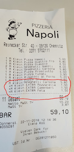 Read morePizzeria's gibt es sehr viele. Viele haben auch einen Lieferdienst. Automatisch denkt man, dass man bei Pizzeria Napoli dies ebenso vorfindet. Dem ist jedoch nicht so und dennoch ist die Pizzeria sehr gut besucht, da es dort sehr gut schmeckt. Man sieht, dass ein Lieferdienst nicht immer notwendig ist, wenn es schmeckt.