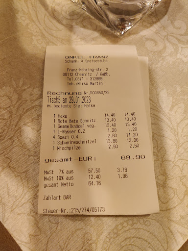Read moreHeute waren wir bei Onkel Franz essen. Vorweg, die Spinatknödel mit Salbeibutter waren wirklich sehr lecker und gut gemacht. Leider ist das auch das einzig Positive, was ich über den Abend sagen kann. Der Service war leider nicht so gut wie die Knödel. Es fing schon damit an, dass man sein Gericht nicht ändern konnte, da es für 1 Person in der Küche zu aufwendig wäre und wir reden hier von Pommes statt Kroketten zum Schnitzel. Sorry, aber das geht wirklich nicht, ich weiß nicht, wo der Aufwand sein soll, etwas anderes in die Fritteuse zu werfen. Leider ging es dann so weiter, dass das Schnitzel nicht durch war, sondern in der Mitte noch roh. Das geht wirklich gar nicht. Leider enttäuschend und kein schönes Erlebnis. Insgesamt wirken die Gerichte sehr einfach und qualitativ nicht hochwertig (bis auf die Spinatknödel).